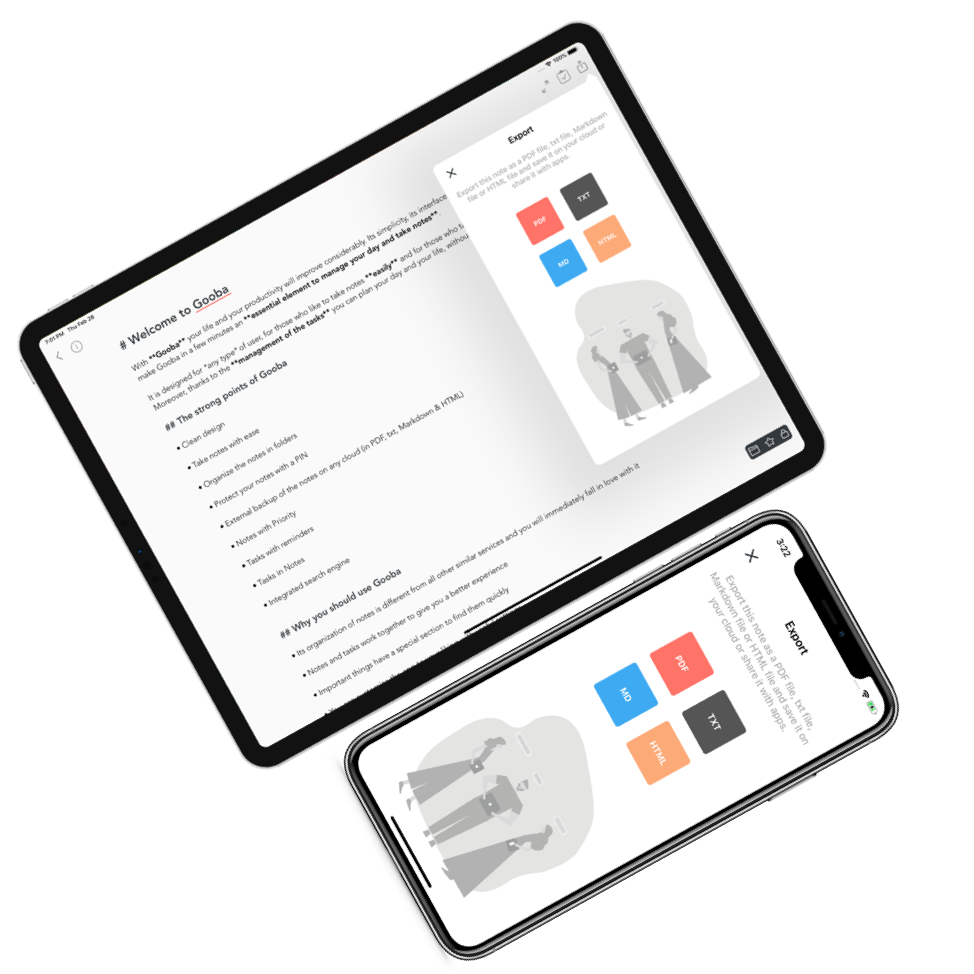 Gooba's notes are universal and can be exported in different formats to use them wherever you want. Currently it is possible to export the notes in PDF, txt, Markdown and HTML.