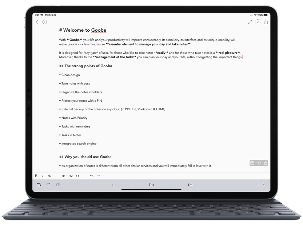 Gooba is not a simple app for notes. But a real writing app. Thanks to Markdown support, writing has never been so simple and beautiful.