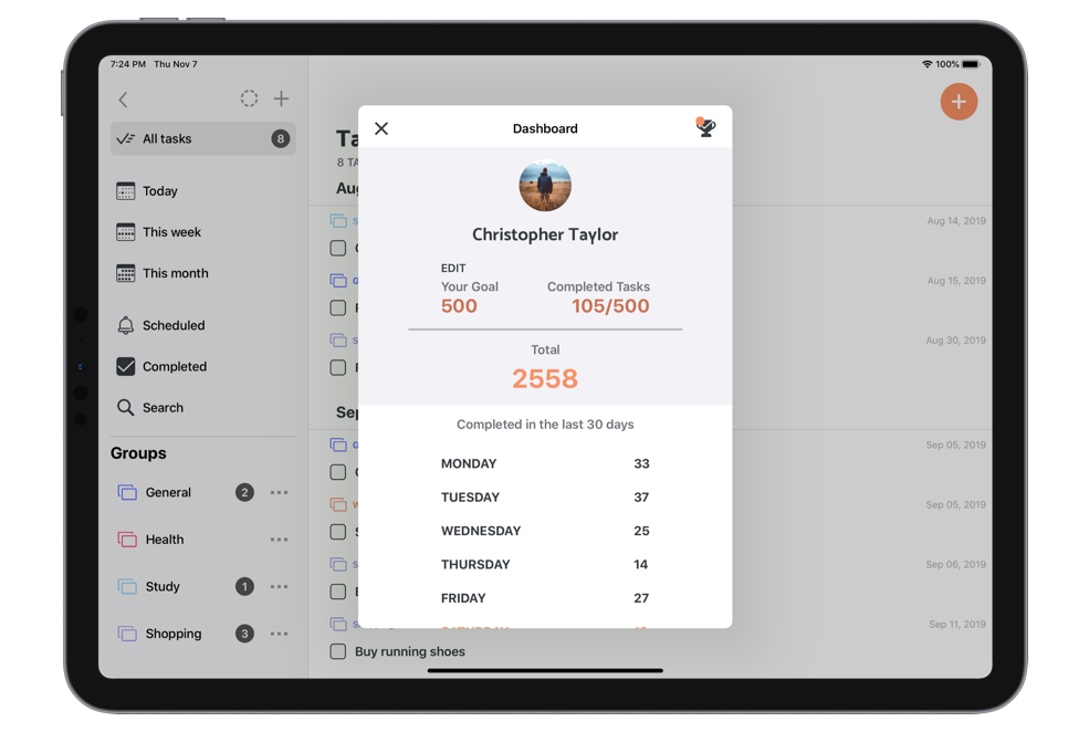 View your progress from this tab. Set a goal and take a look at the days of the week when you are most productive.